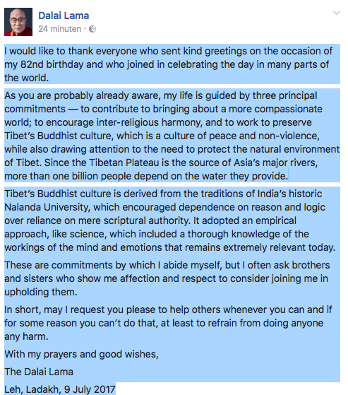 Dit las ik net op facebook, een bericht van de Daila Lama. Het is nog steeds geen alom geaccepteerd geloof of leef principe, en toch ‘moet’ er waarheid inzitten want anders zouden men (ik) er niet zo tegen vechten. Ik wil wel zo leven met al mijn menselijke ups en downs en nog vele misinterpretaties. Vooral de laatste deel van de laatste zin, daar geloof ik al jaren in en denk of hoop dat ik daar ook meerendeel van de tijd al volgens leef en werk – en dat werk dan ook nog in de harde corporate wereld waar inlevingsvermogen, vertrouwen en het durven hebben van oprechte interesse soms onder een dikke laag beschermende boksbeugels verstopt zit. Volgens mij hoef je niet te boksen – okay tenzij voor conditie training 🙂 om dat je daarmee fit bent om onterechte hardheid zelf aan te kunnen!!!. Mijn wens in het klein voor mijzelf is meer en meer vredelievend te bewegen en heel benieuwd wat daarmee verder beweegt.